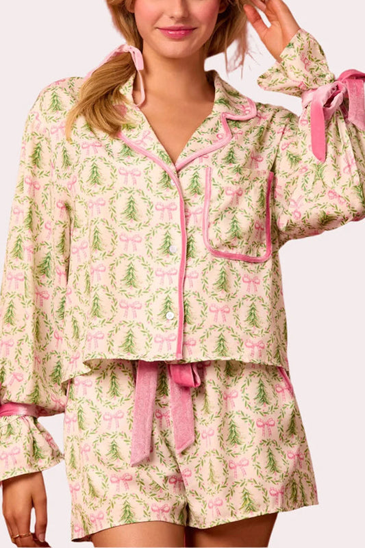Christmas Print Bow Top and Elastic Waist Tie Pocket Lounge Shorts Set