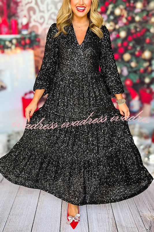 Christmas Elegant Sequin Long Sleeve V Neck Midi Dress