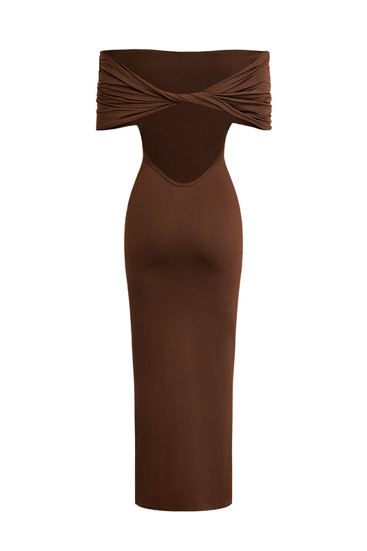 Braunes Gedrehtes Rückenfreies Off Shoulder Maxi Kleid
