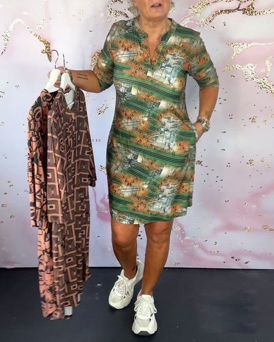 Casual V-neck dress with retro print