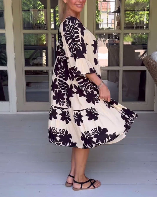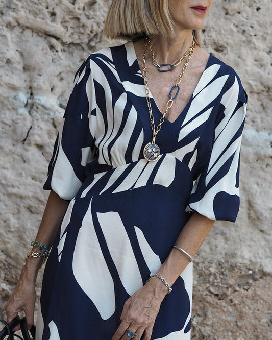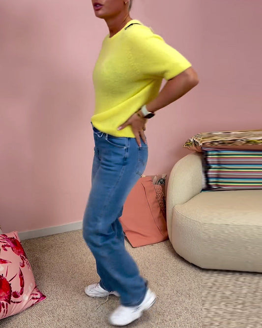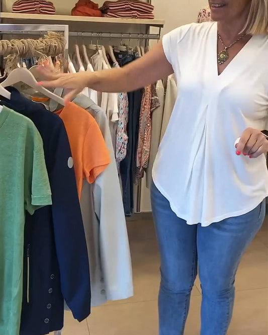 Casual, solid-coloured blouse with v-neck and three-quarter sleeves in patchwork style