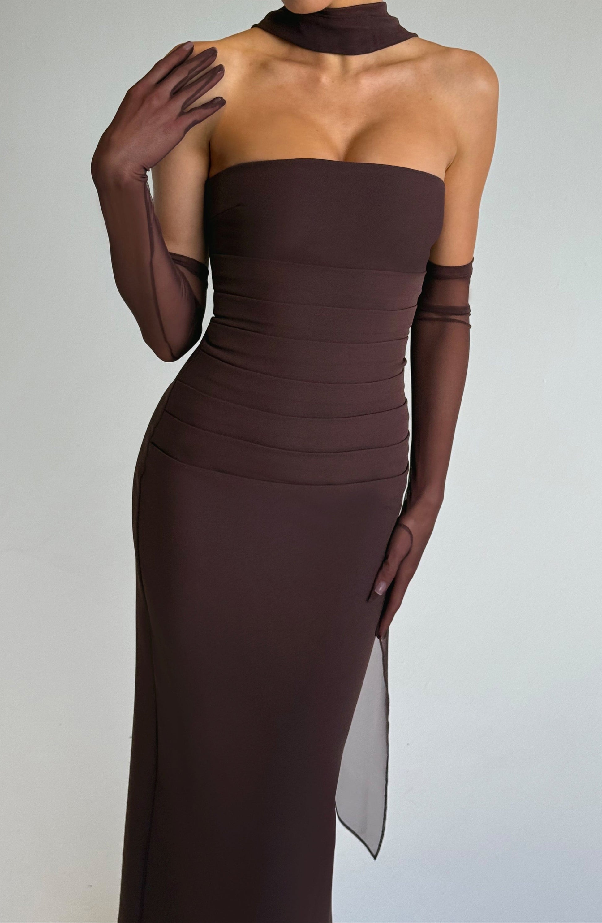 This sophisticated maxi dress combines timeless elegance with modern versatility. Crafted from luxurious, non-stretch crepe, the strapless silhouette features a structured bodice and graceful column skirt.