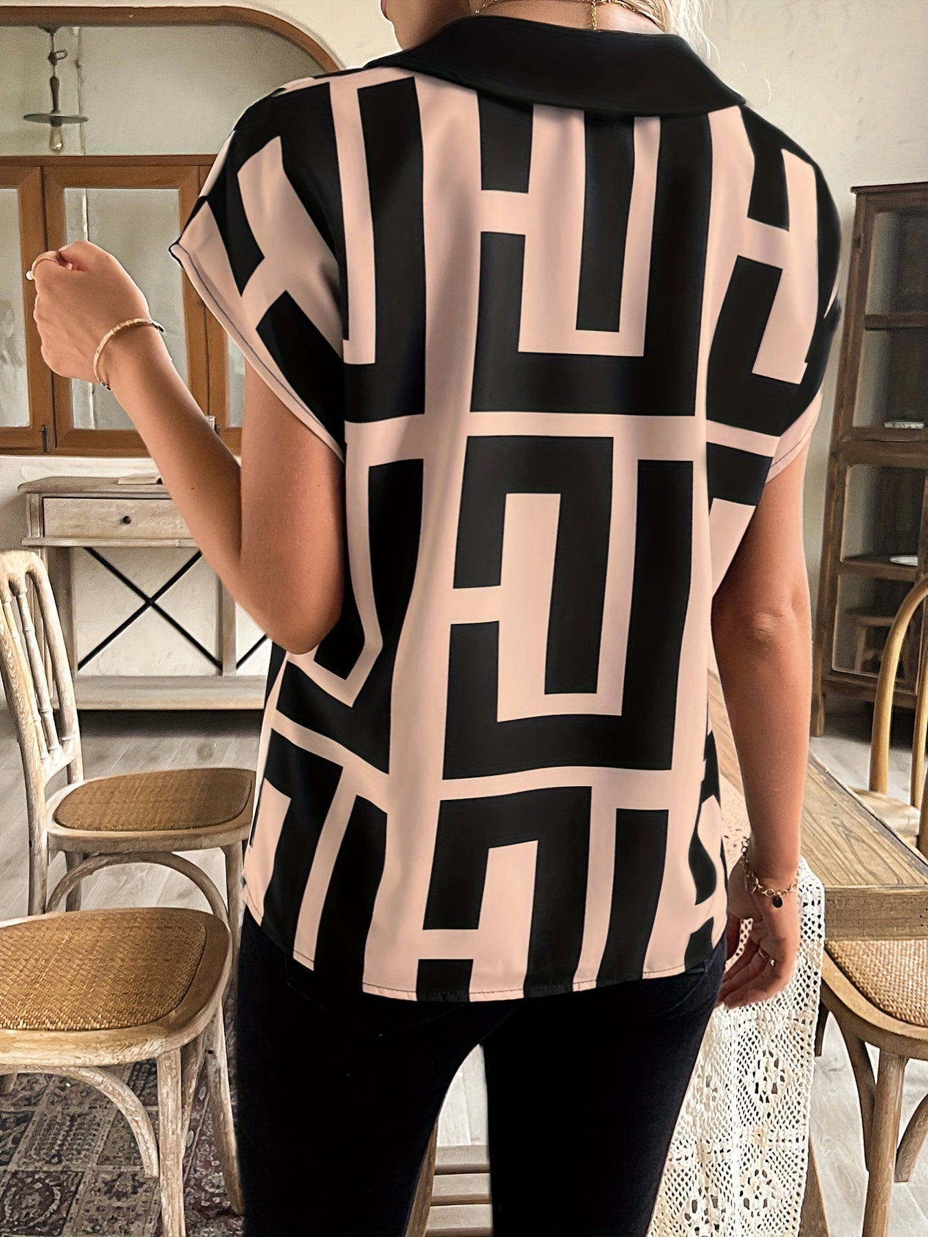 Stylish and comfortable: The unique patterns and soft fabric ensure a comfortable fit, even on long days. The fitted cut and short sleeves offer a comfortable fit, while the V-neck and detailed workmanship add practical and stylish details. This blouse is ideal for creating an elegant yet relaxed look that expresses your personality.
