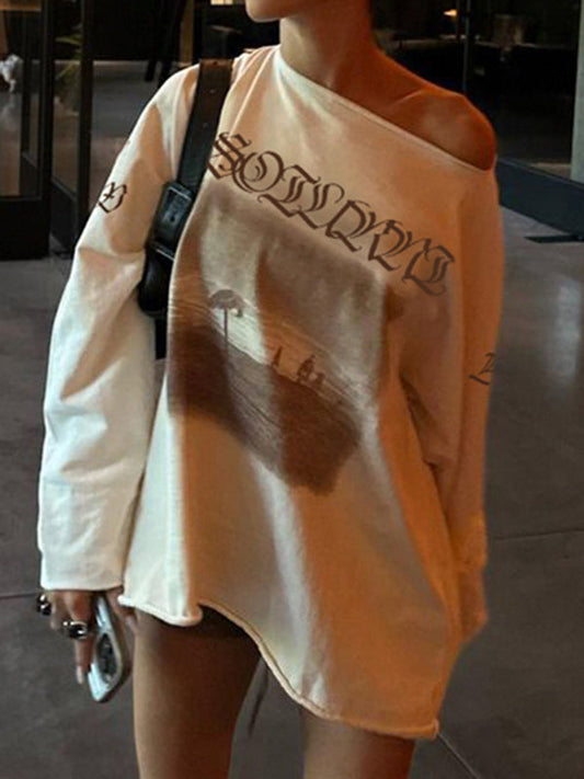 Vintage Oversized Print One Shoulder Long Sleeve Shirt