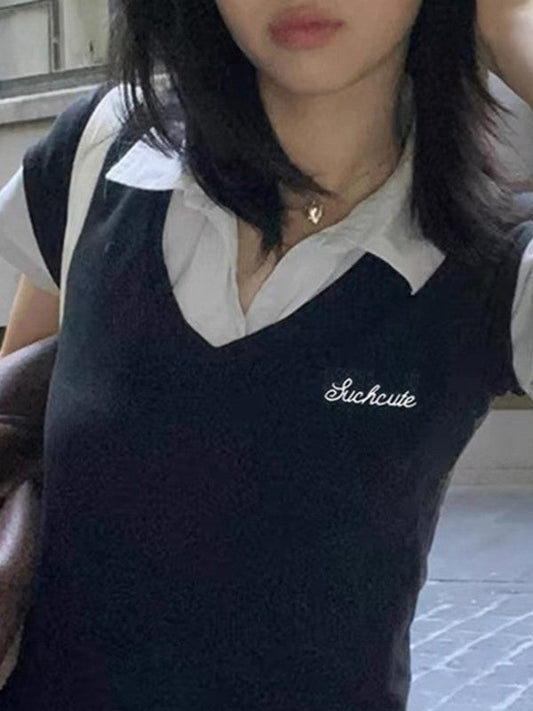 Vintage Lettering Embroidery Two-Piece Look Polo Collar Top