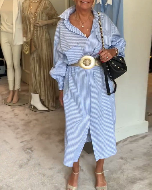 Vestido elegante de rayas con solapas.