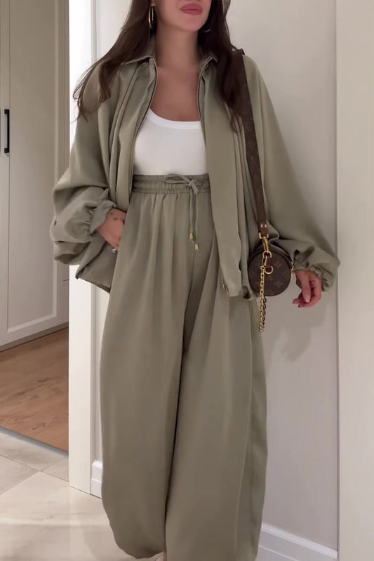 Lantern-sleeve zipper jacket and elastic waistband wide-leg pants two-piece set