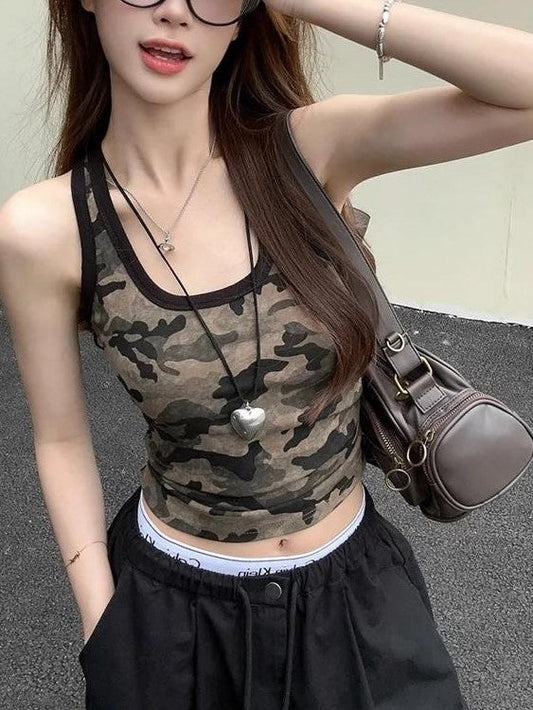 Vintage Print Zipper Sleeveless Slim Fit Overalls