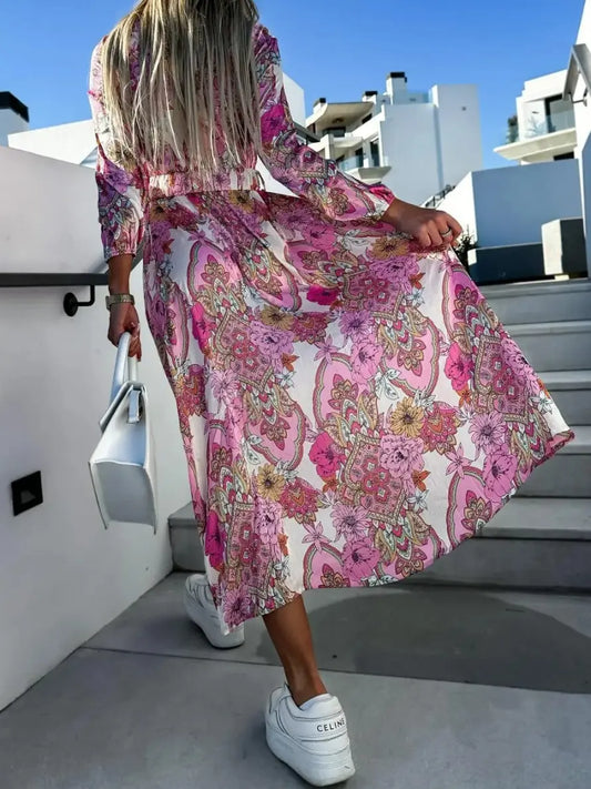 'Radiosa' dress with V-neck and floral pattern