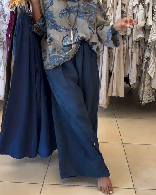 Hose elastische Taille Knopf-Deko Weitbein lang