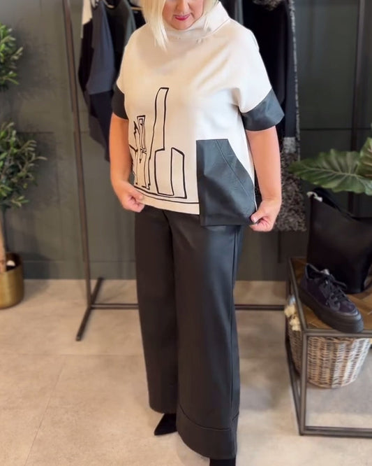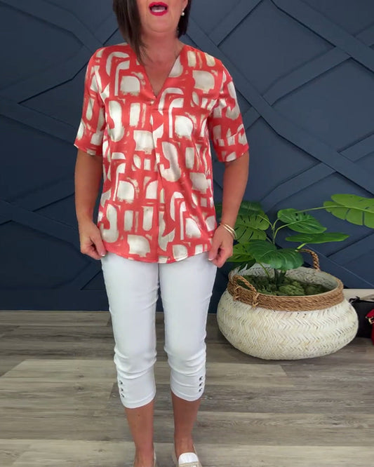 Kortermet topp med V-hals og kontrasttrykk