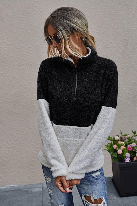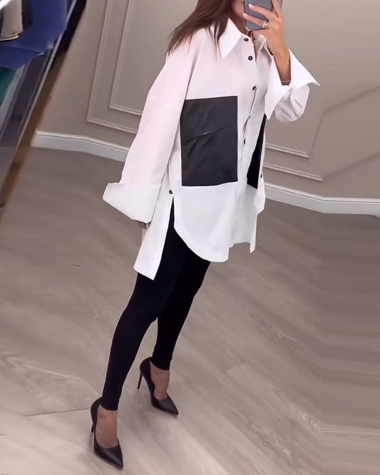 Uformell bluse med høy krage og fargeblokkdesign
