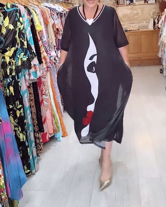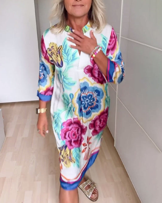 Uformell, fargerik trykket kjole med korte ermer og V-hals