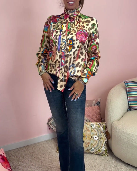 Uformell dyp V-hals kjole med leopard og fargerikt trykk