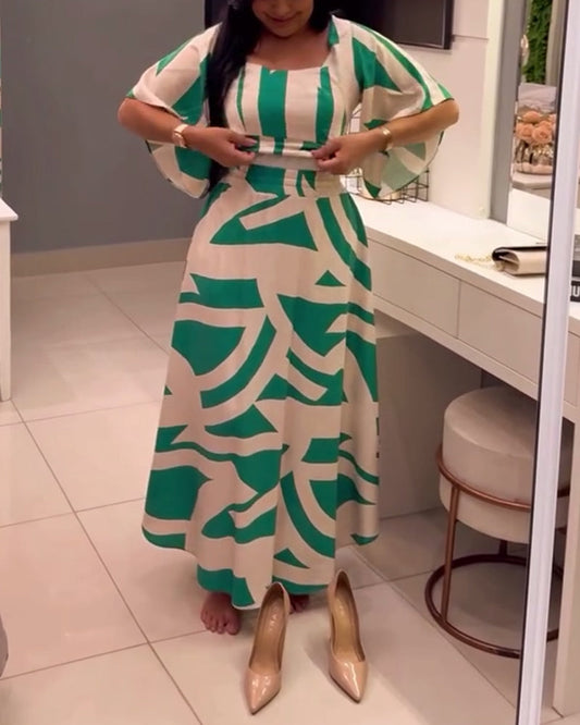 Moteriktig printet kjole med rund hals og korte ermer