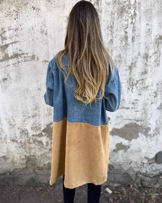 Suit collar denim patchwork mid-length coat