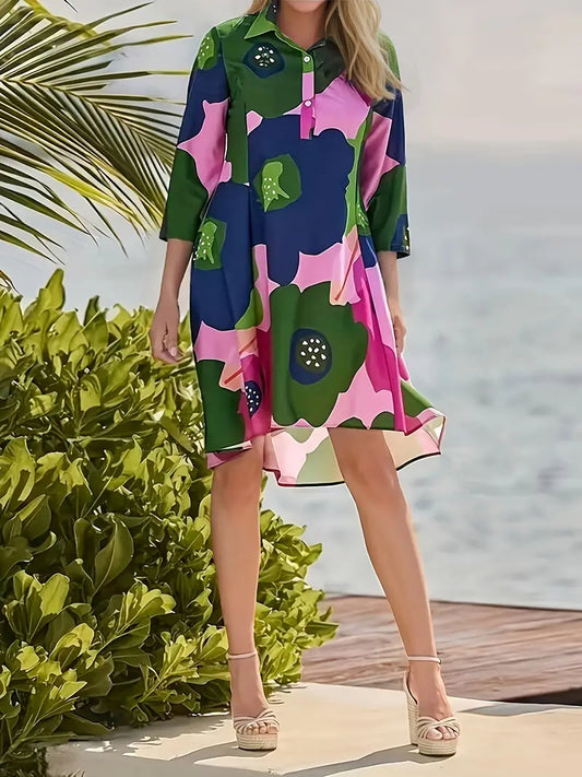 Suzen - Elegant kjole med 3/4-ermer, blomstertrykk og krage