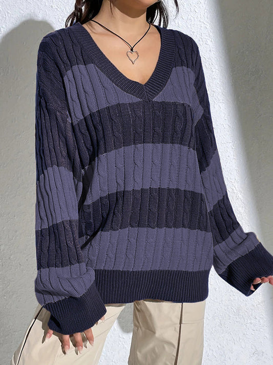 Vinatge Lila Kontraststreifen Pullover mit V-Ausschnitt
