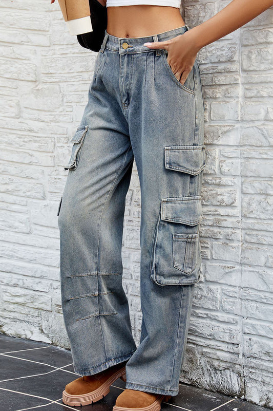 Bleket denim arbeidsbukse med vidde ben med flere lommer