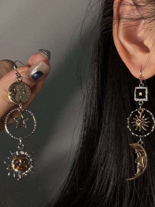 Vintage Asymmetrische Sonnen Mond Anhänger Ohrringe