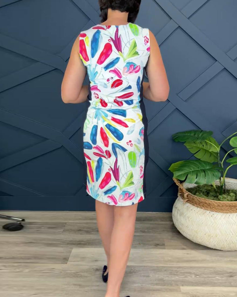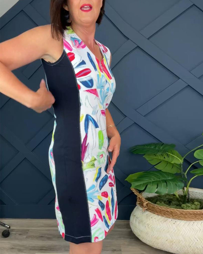 Ärmelloses kleid mit modischem druck und reißverschluss