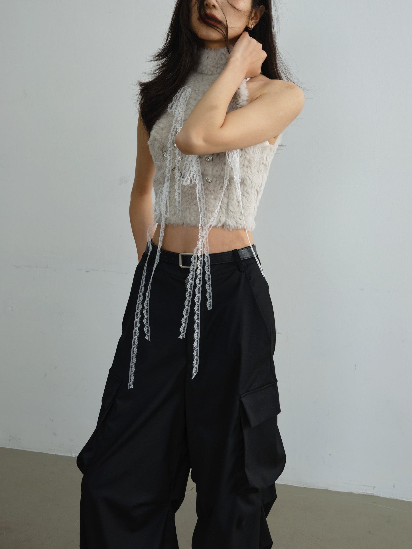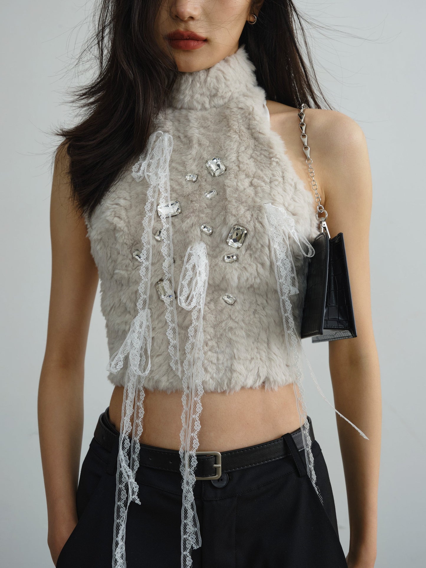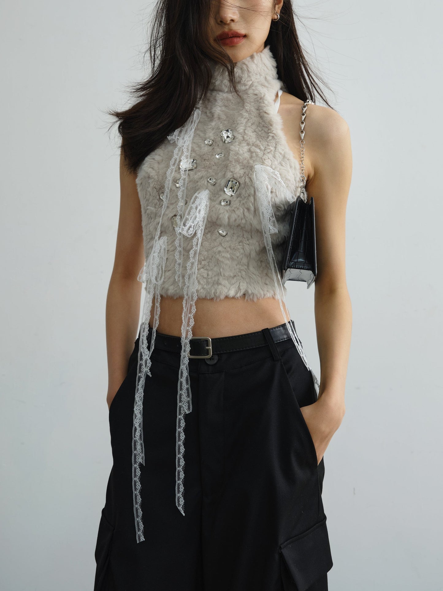 Beige Pelz Spitze Quaste ärmelloses Crop Top