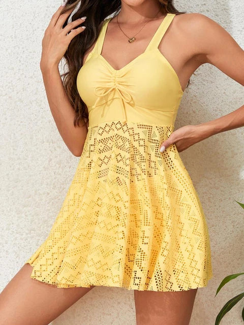 Sonniges Design: Mit seinem strahlend gelben Farbton und dem charmanten Knotendetail am Oberteil fängt dieser Beach-Skirtini die Essenz des Sommers ein und bringt Ihre sonnengeküsste Haut zum Leuchten.