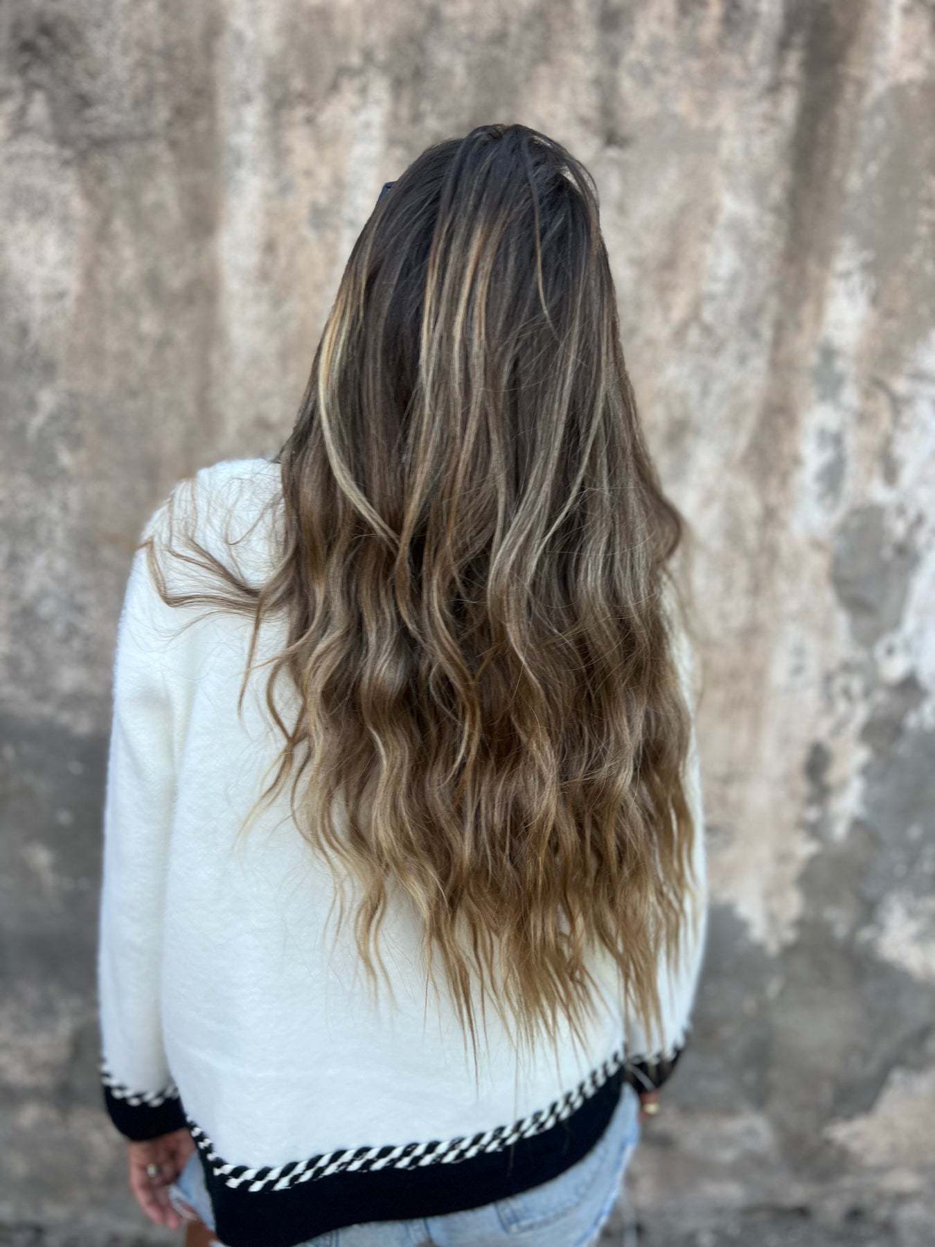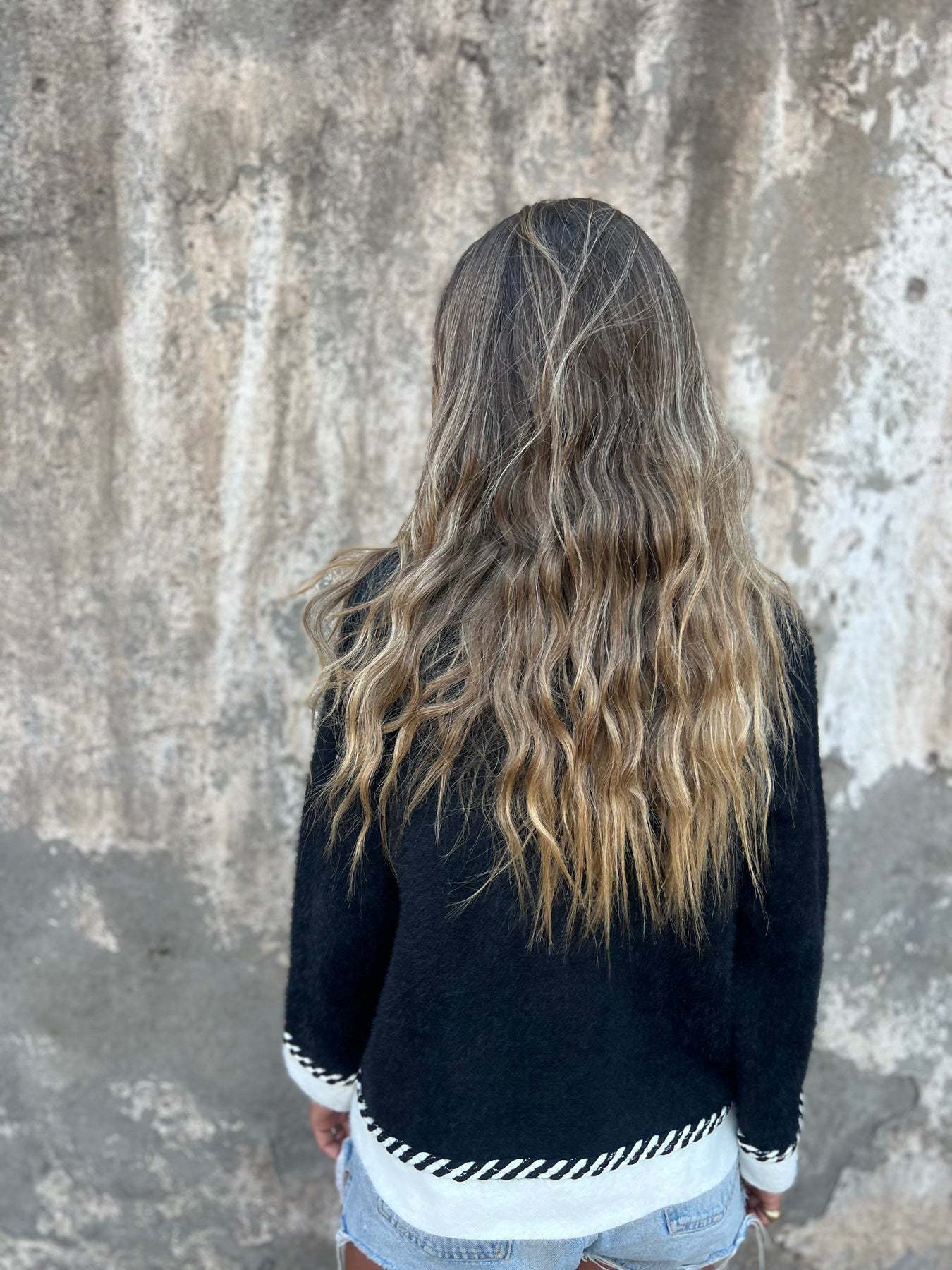 This black and white contrast long-sleeved knitted jacket combines classic monochrome style with practical design. Featuring a button front and convenient pockets, it offers both functionality and timeless appeal. The knit fabric provides warmth and comfort, making it a versatile layering piece suited for various occasions. Its sharp color contrast enhances visual interest while maintaining a sophisticated look.
