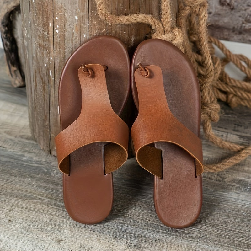 Stilvolles Design und Komfort: Das schlichte, aber dennoch elegante Design in Braun macht diese Flip-Flops zu einem vielseitigen Begleiter für Ihre Sommergarderobe. Das weiche Leder und die ergonomische Sohle sorgen für ein angenehmes Tragegefühl den ganzen Tag über.