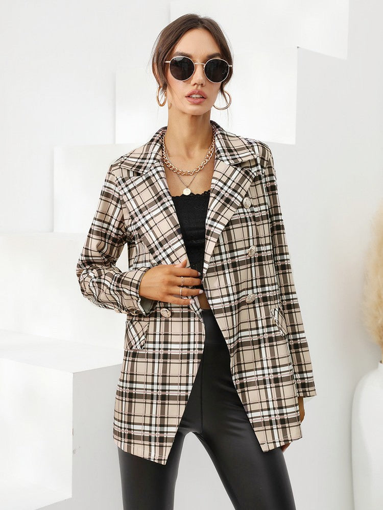 Dieser schöne double-breasted Blazer hat lange Ärmel, einen Reverskragen, Knöpfe, zwei Taschen und Zierknöpfe an den Ärmeln. Der Blazer ist leicht tailliert und hat einen Karodruck.