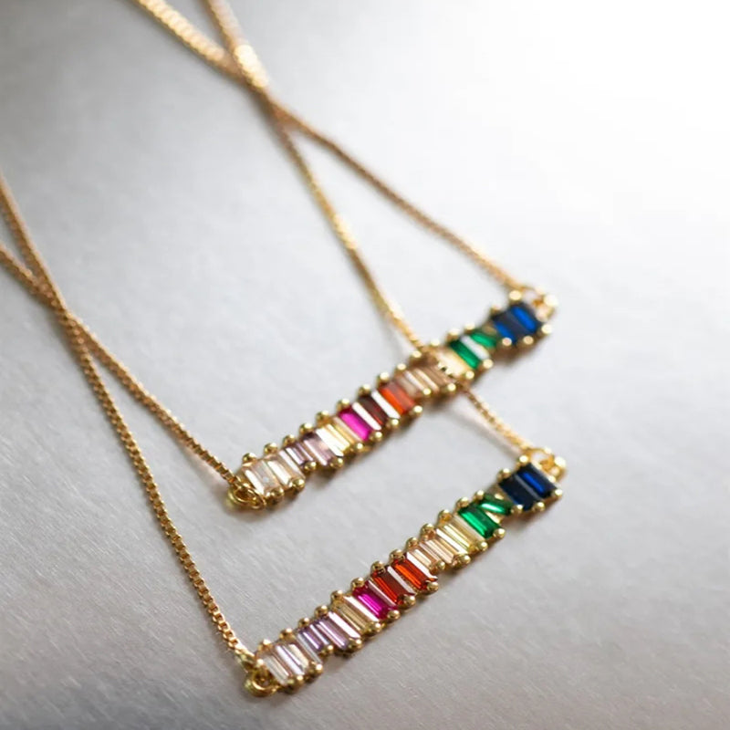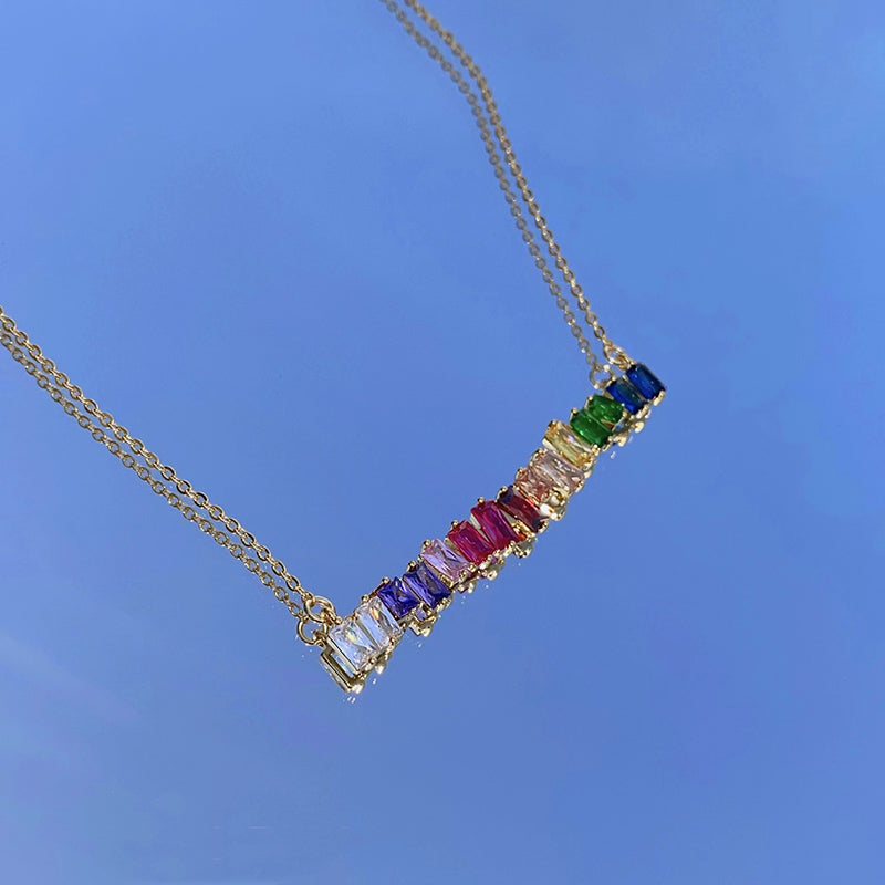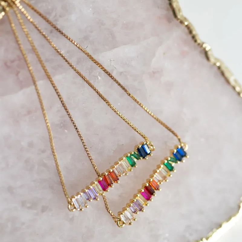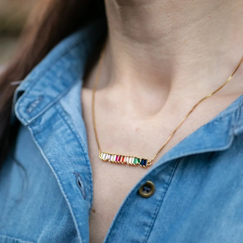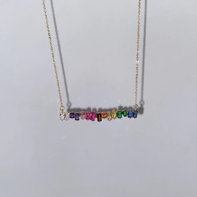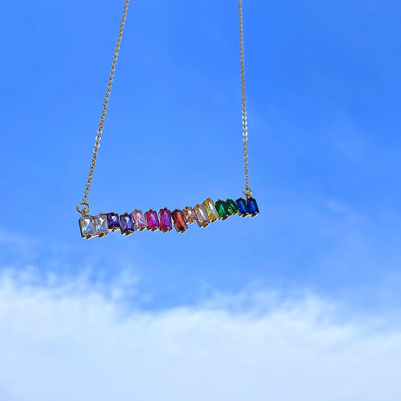 Die bezaubernde Farbpalette dieser Halskette fängt perfekt den Glanz und die Freude des Regenbogens ein und verleiht Ihrem Look eine auffällige und ansprechende Note. Die funkelnden Strasssteine bringen zusätzlich einen Hauch von Glamour und Eleganz in Ihre Garderobe.