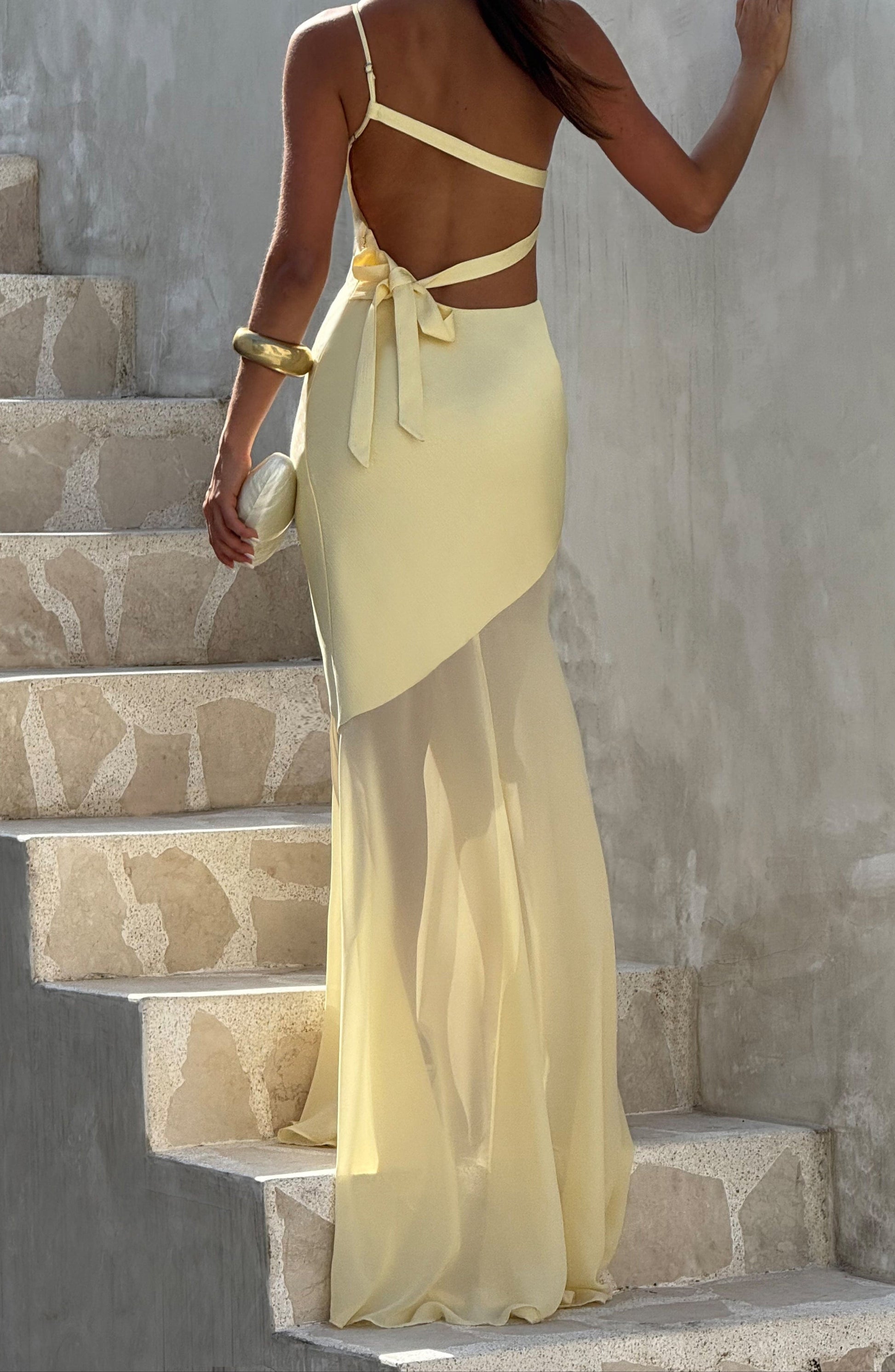 Dieses Maxikleid in Zitronengelb ist ein Meisterwerk moderner Eleganz mit zeitlosem Design. Aus strukturiertem Satin ohne Stretch gefertigt und mit einem kontrastierenden Chiffonrock kombiniert, fällt es besonders edel und sorgt für eine unvergessliche Silhouette.