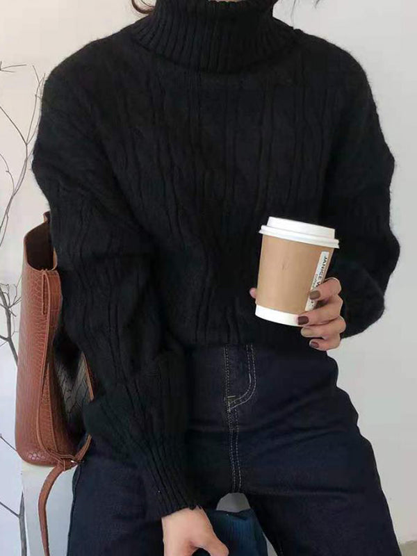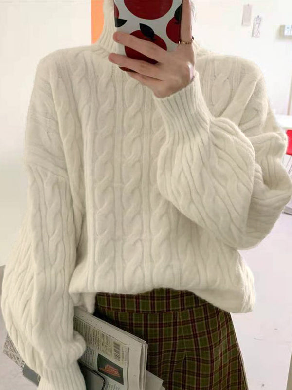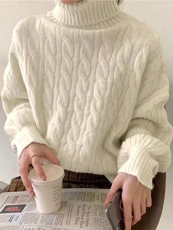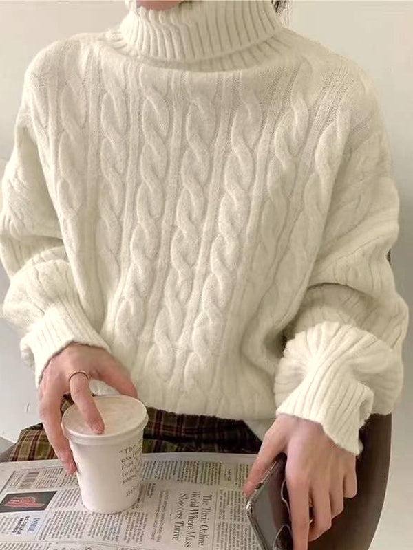 Einfarbiger Hochkragen Kabelstrickpullover