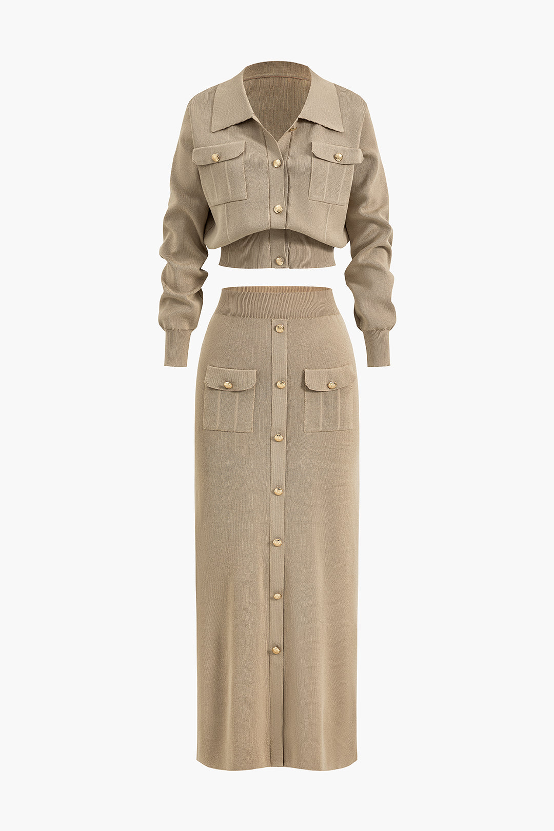 Zeitloser Vintage-Stil: Tauchen Sie ein in retro-elegante Looks mit diesem einfarbigen, vintage-inspirierten Crop-Top mit Knopfleiste und Maxirock-Set. Das klassische Design und der gemütliche Strickstoff sorgen für einen schicken, nostalgischen Look, der zu jeder Jahreszeit passt.