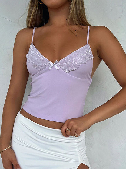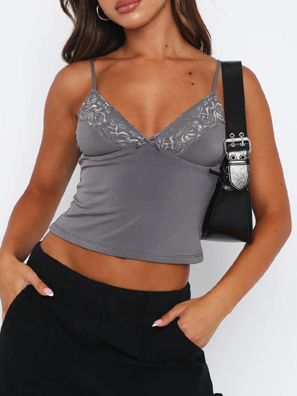 Einfarbiges Vintage Spitzenbesatz V-Ausschnitt Cropped Cami Top