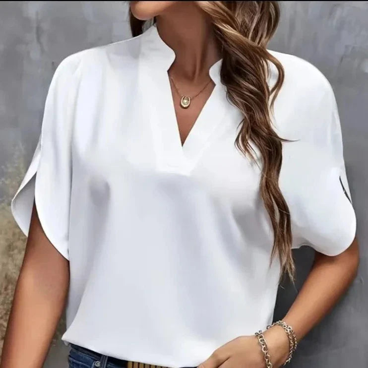 Dieses elegante Oberteil aus weicher Kunstseide besticht durch seinen einzigartigen, geschlitzten Ausschnitt. Die lockeren, fließenden Ärmel sorgen für einen modernen und dennoch zeitlosen Look. Perfekt für sowohl formelle als auch legere Anlässe, bietet es vielseitige Kombinationsmöglichkeiten.