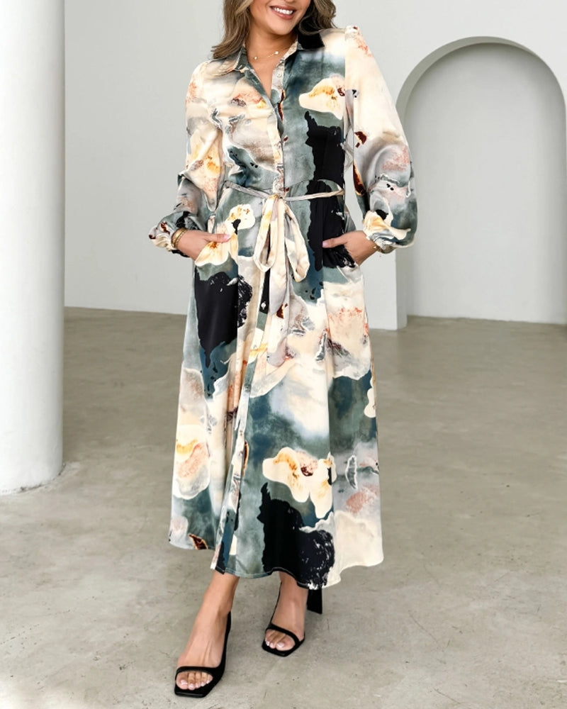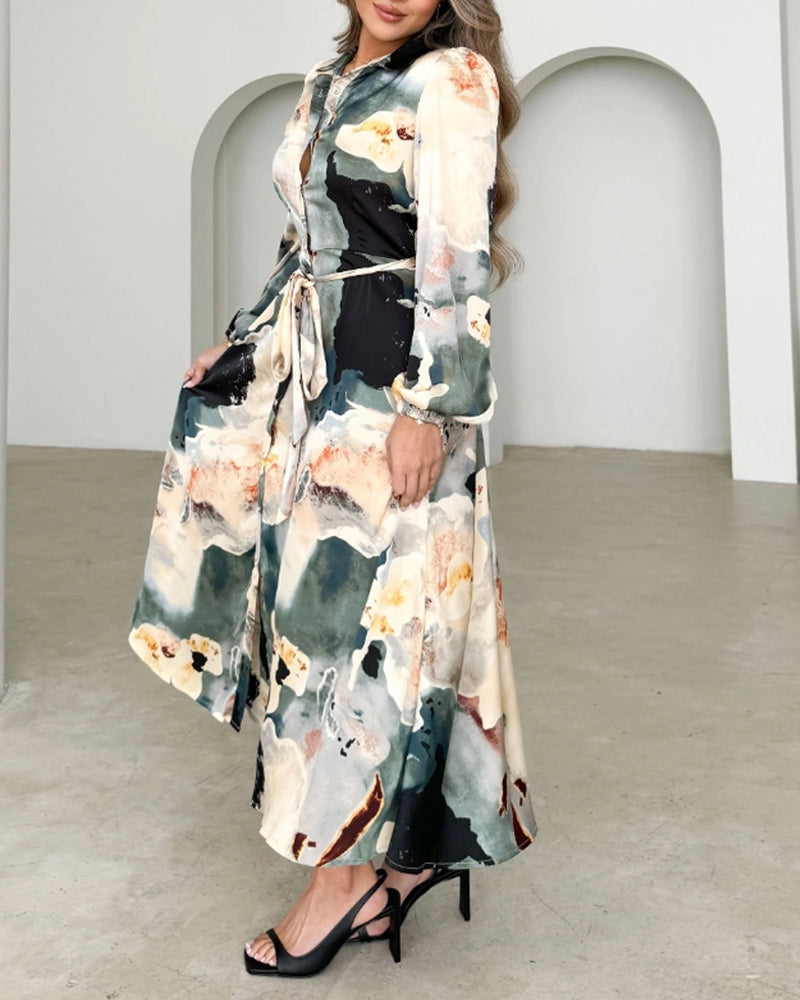 Elegantes bedrucktes kleid mit reversschnürung und langen ärmeln
