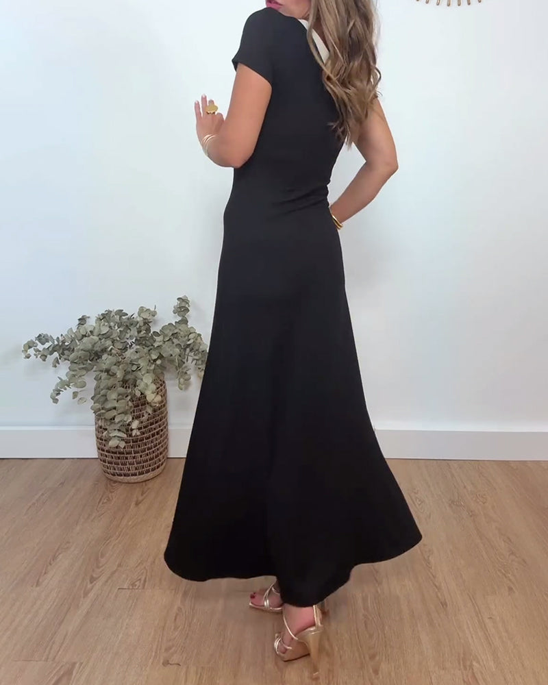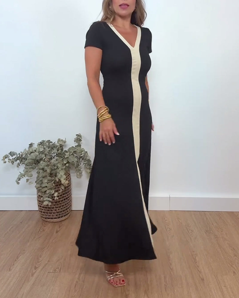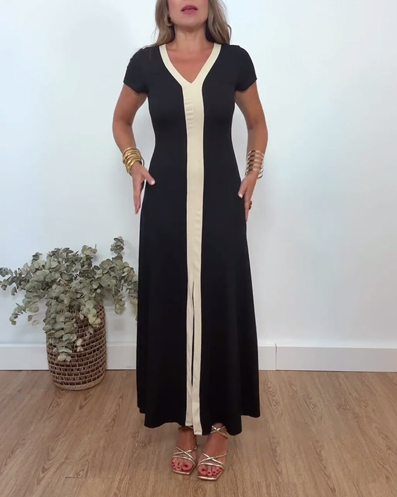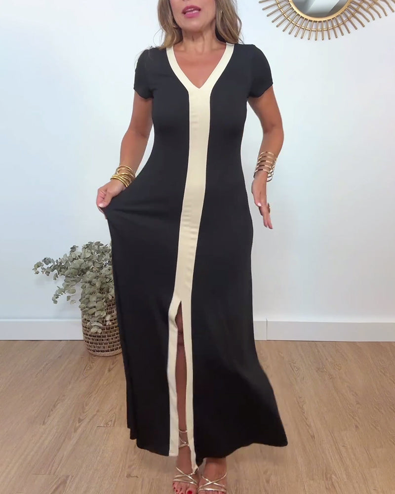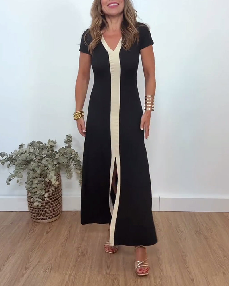 Elegantes Kleid mit V-Ausschnitt und Schlitz im Kontrastdruck