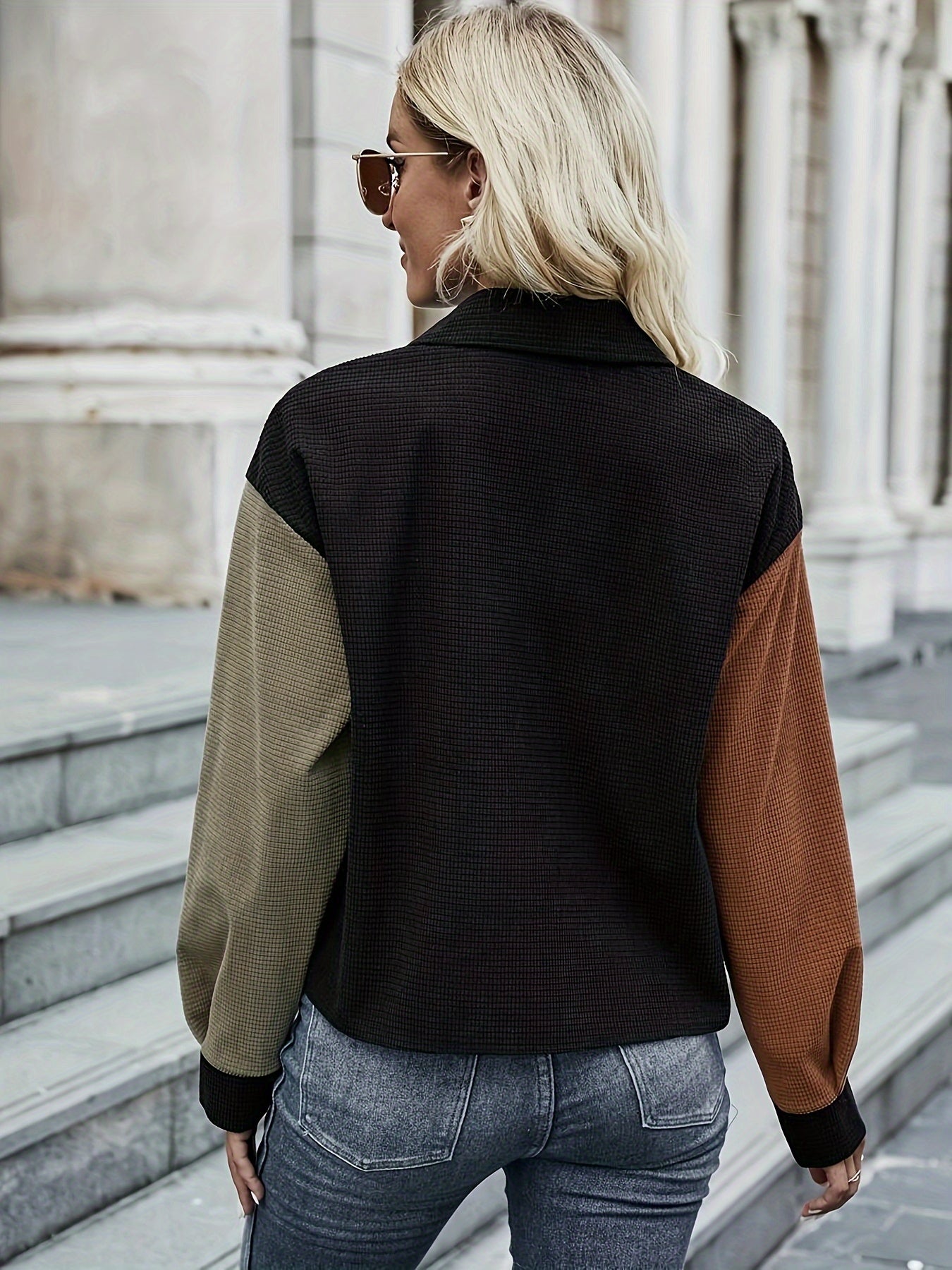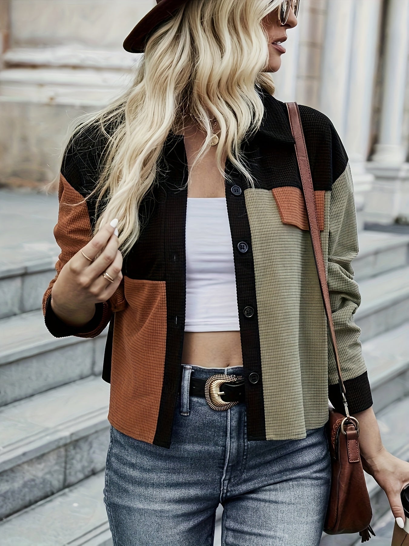 Die Farbblock Drop Shoulder Jacke - Mia ist das perfekte Kleidungsstück für Frauen, die Wert auf einen trendigen und gleichzeitig lässigen Look legen. Mit ihrem auffälligen Farbblock-Design und der bequemen Passform setzt diese Jacke ein modisches Statement, das sich leicht mit verschiedenen Outfits kombinieren lässt.