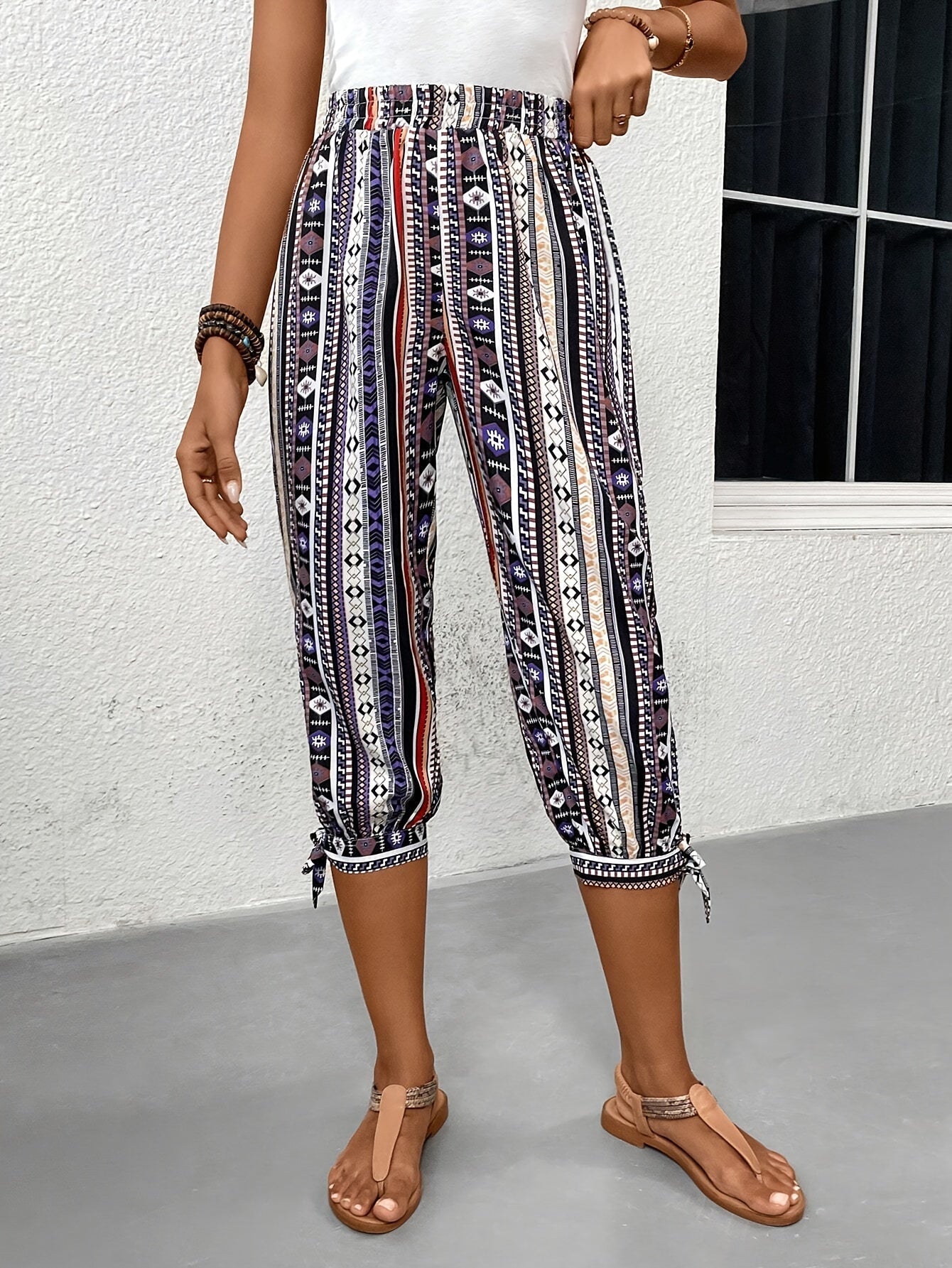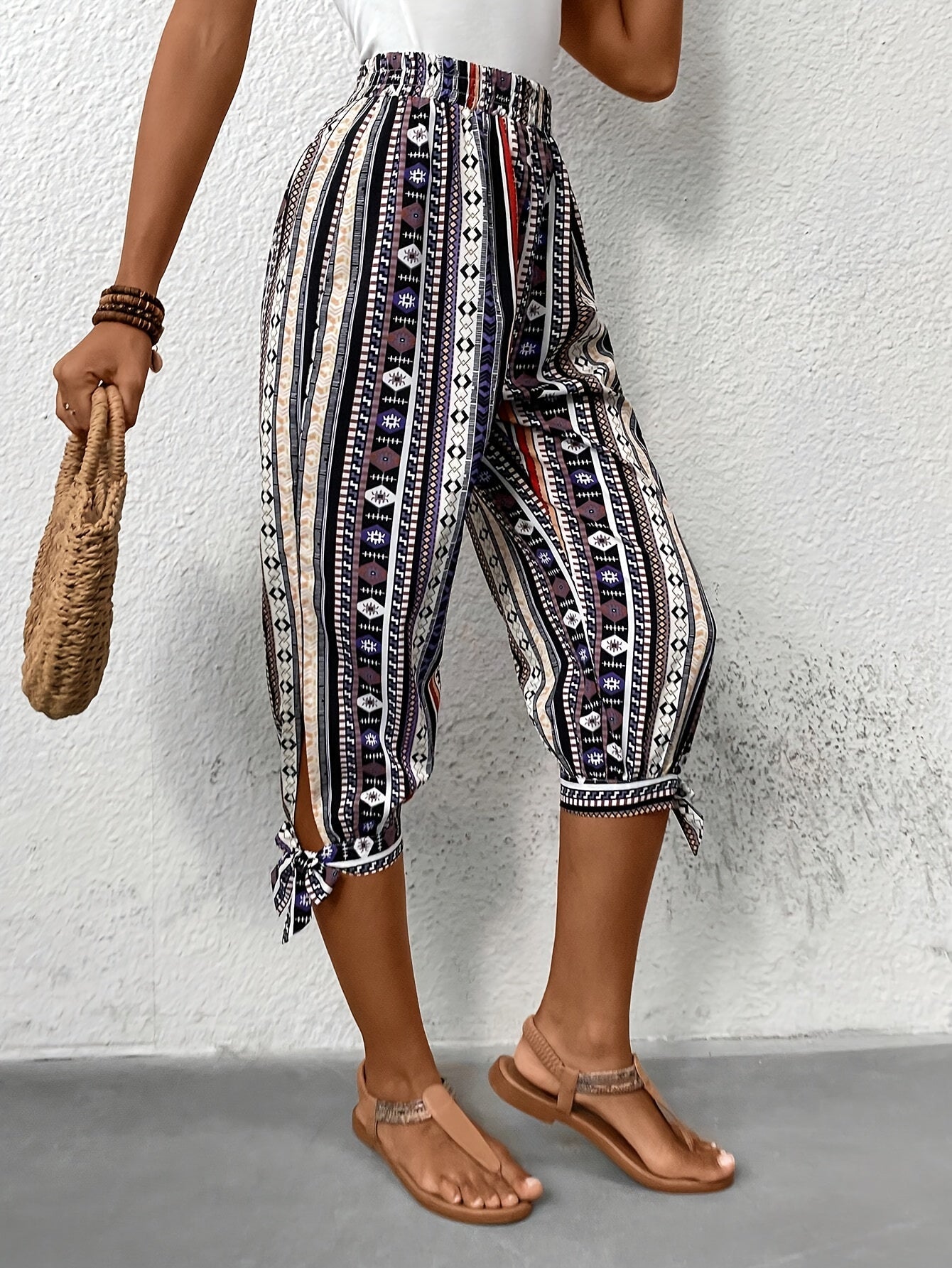 Entdecken Sie den perfekten Mix aus Stil und Komfort mit unserer gestreiften Caprihose mit Ethno-Muster. Diese modischen Hosen sind ideal für die moderne Frau, die nach einem vielseitigen und bequemen Kleidungsstück für den Sommer sucht. Genießen Sie die Leichtigkeit und den stilvollen Look in jedem Schritt.