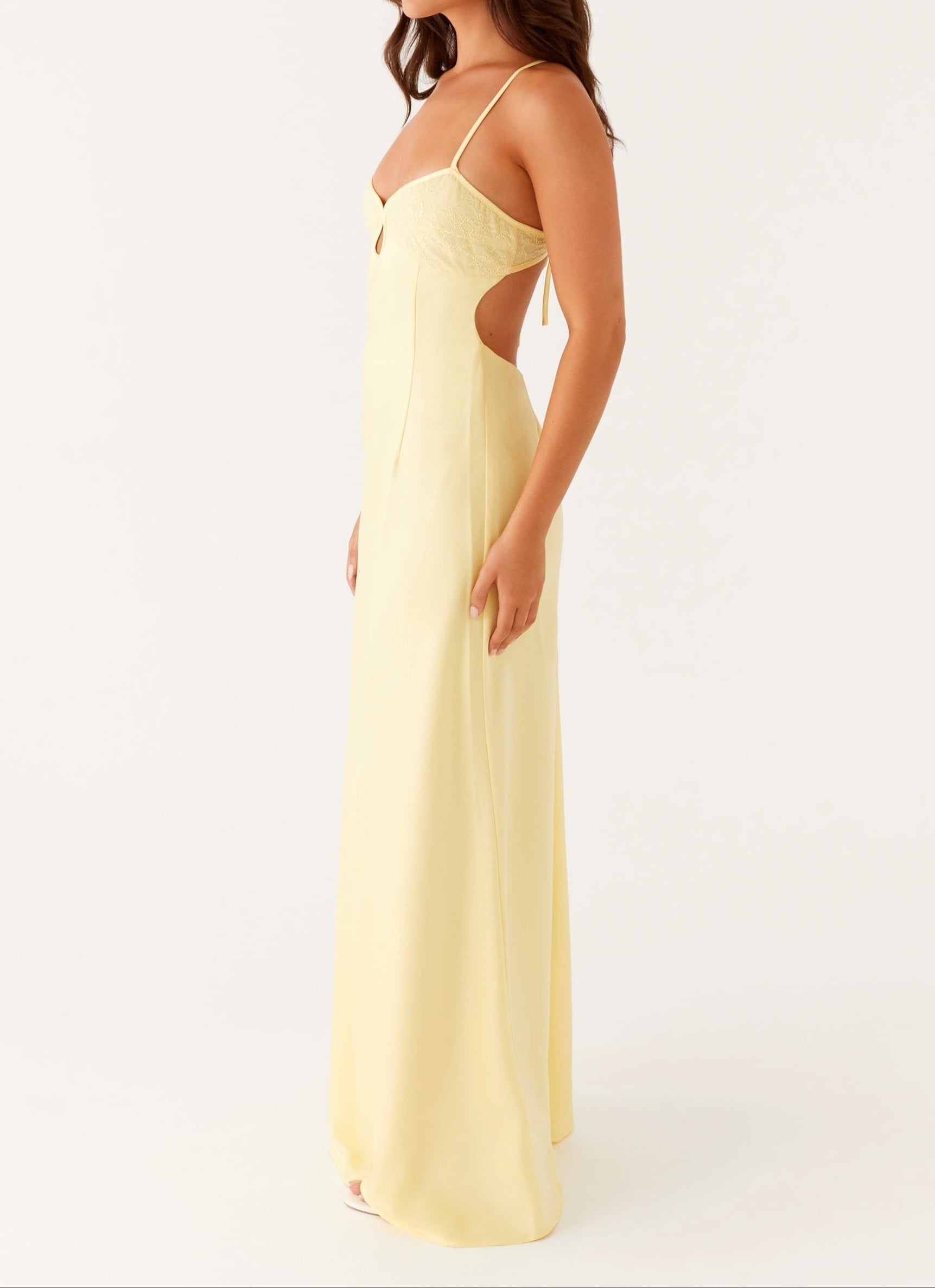 Verkörpere zeitlose Romantik mit einem gewagten Twist in diesem atemberaubenden Satin-Maxikleid, das mit seinem eleganten Sweetheart-Ausschnitt und dem verführerischen Rückenausschnitt alle Blicke auf sich zieht. Die fließende Silhouette im schrägen Schnitt und die verstellbaren Details sorgen für eine perfekte Passform – ideal für Gartenpartys und stilvolle Abendveranstaltungen.