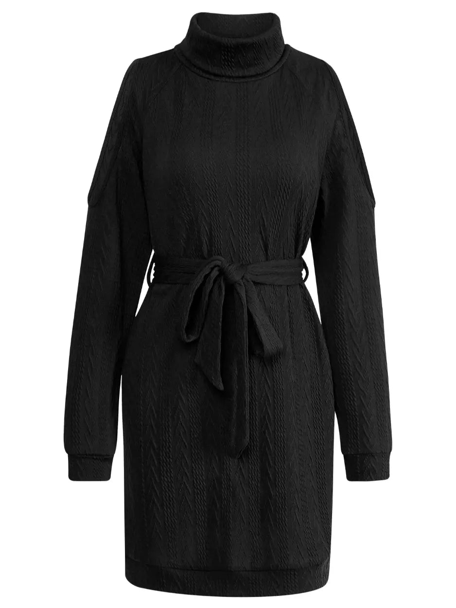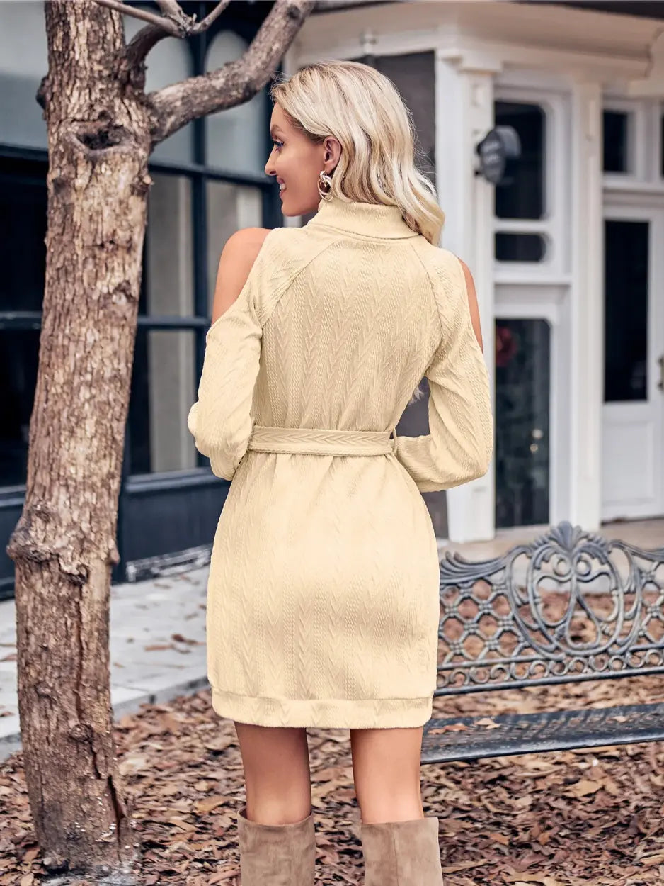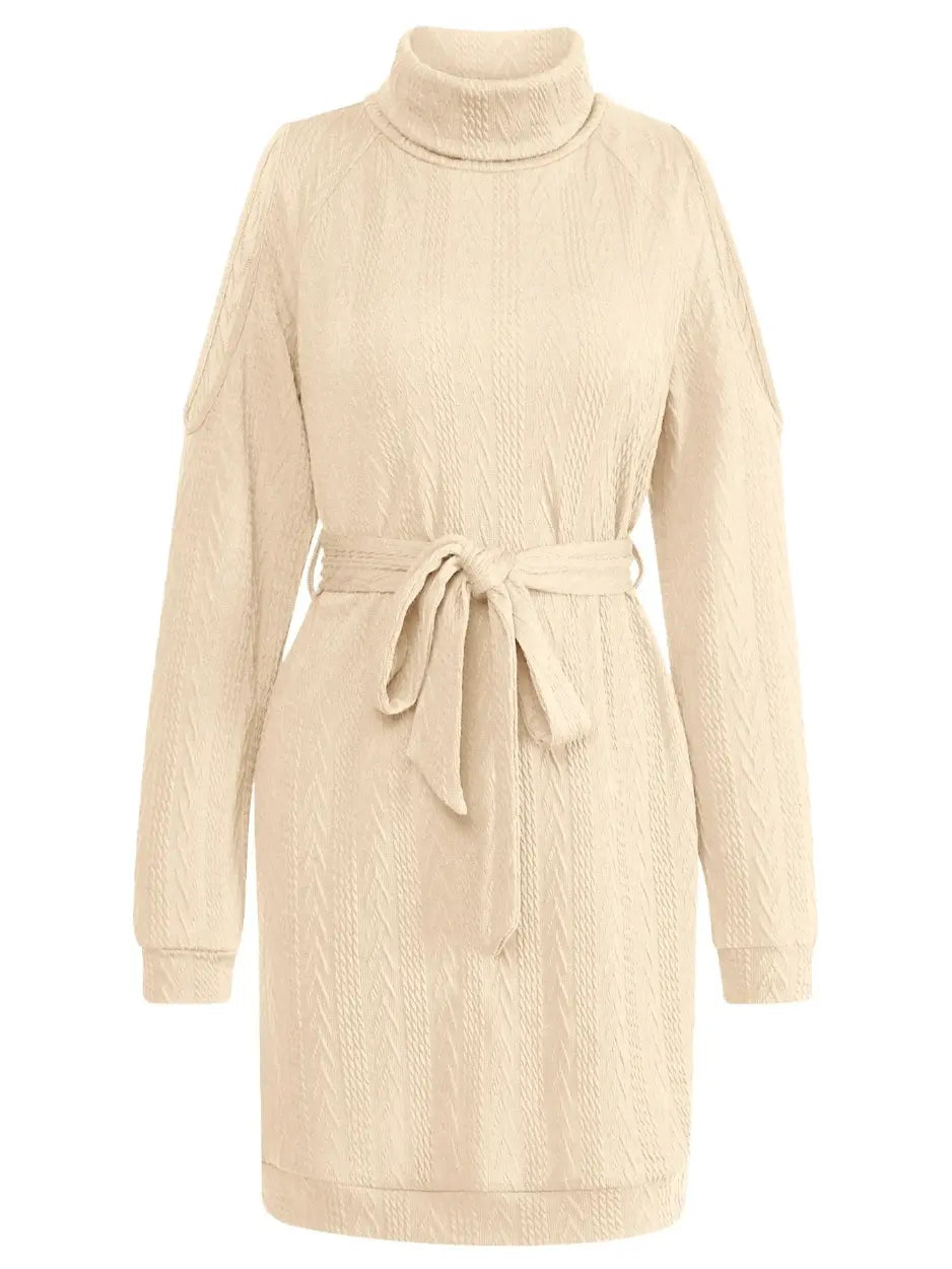 Dieses stilvolle Kleid mit Cut-Out-Ärmeln und Stehkragen bietet einen modernen Look. Der Taillengürtel sorgt für eine feminine Silhouette und betont deine Figur. Perfekt für modische Anlässe und trendige Outfits.