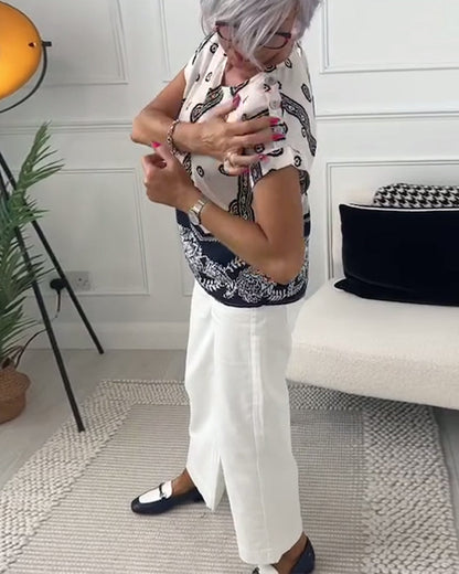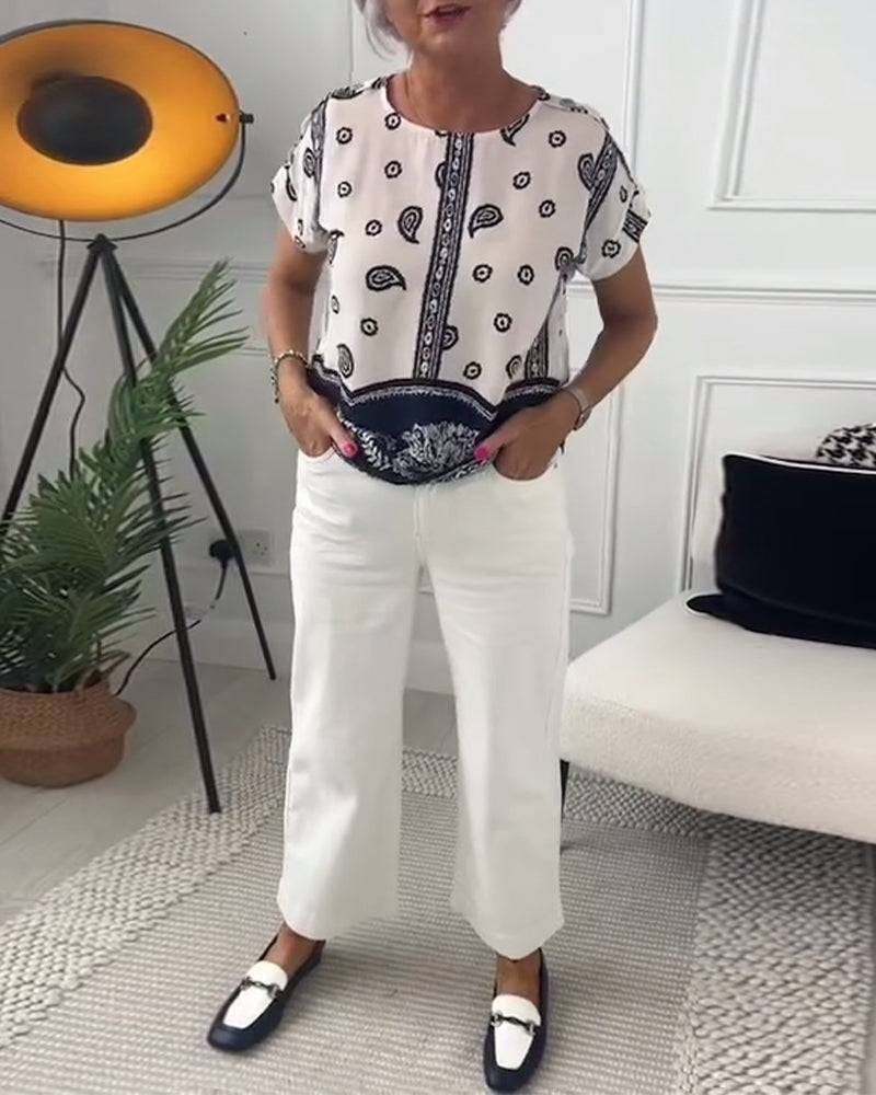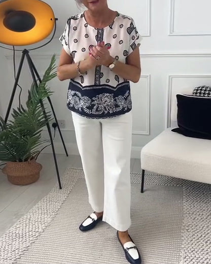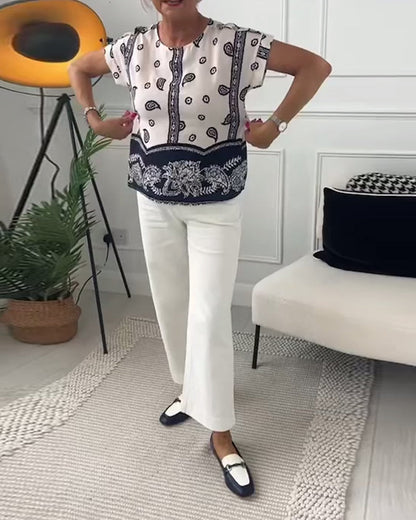 Kurzarmbluse mit Rundhalsausschnitt und Kontrastdruck
