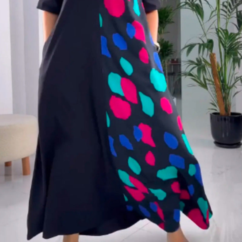 BEDRUCKTES DESIGN: Dieses Kleid kombiniert Unifarben mit bedruckten Mustern und bietet einen stilvollen Kontrast, der Monotonie verhindert und lebendige visuelle Akzente setzt.