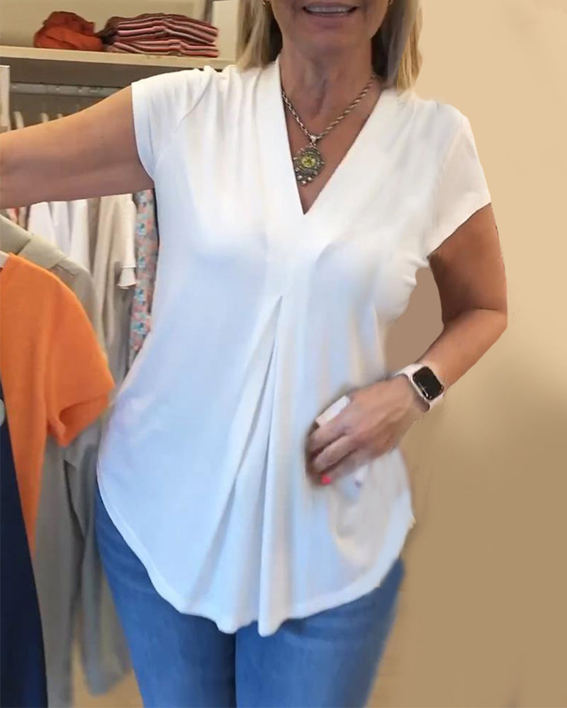 Lässige, einfarbige bluse mit v-ausschnitt und falten