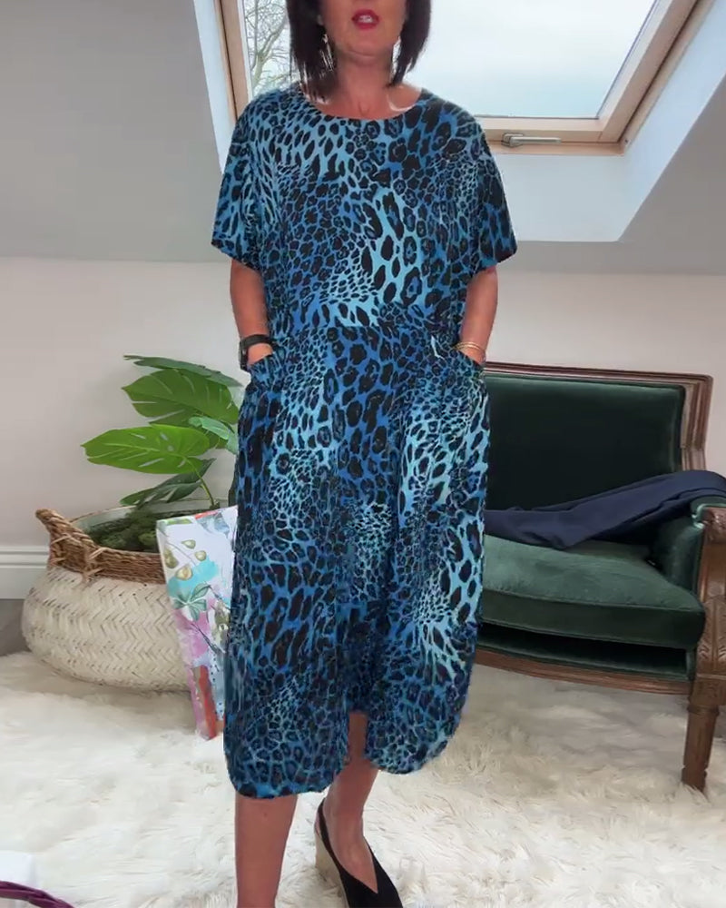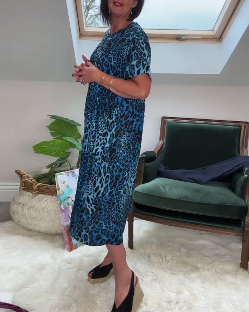 Lässiges Kurzarmkleid mit Rundhalsausschnitt und Leopardenmuster