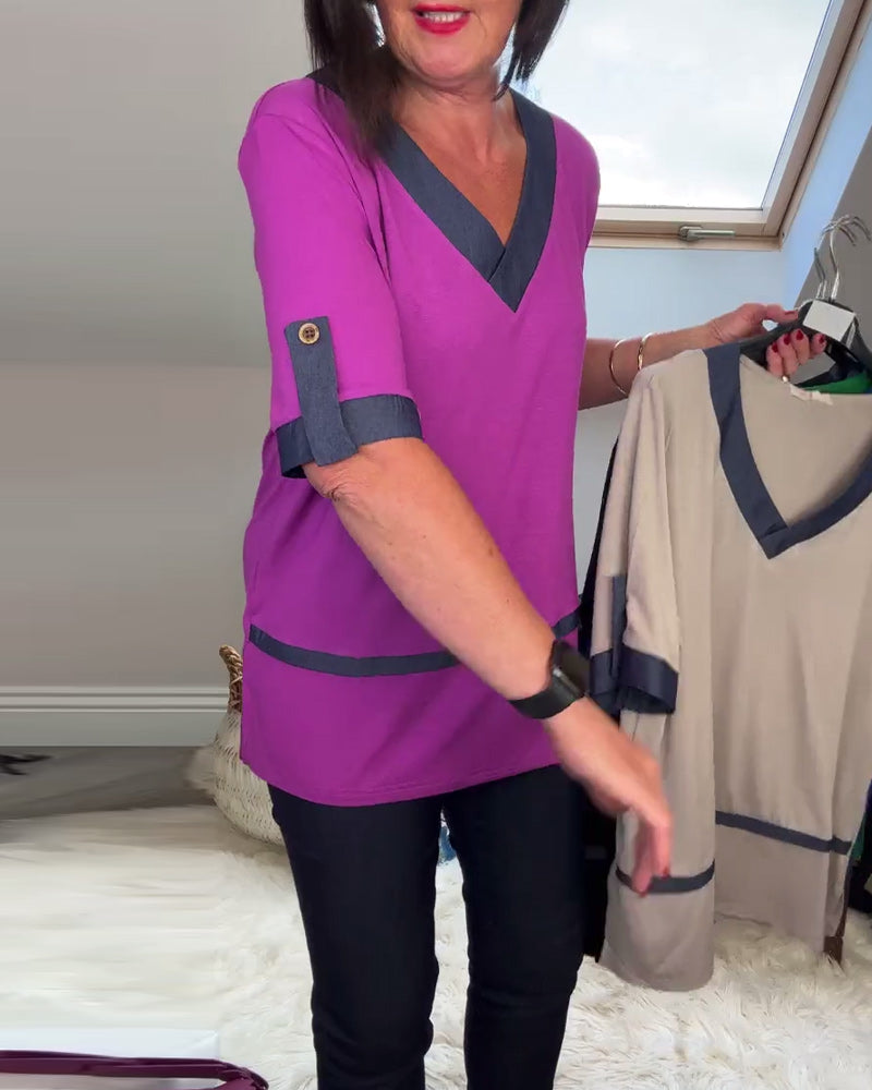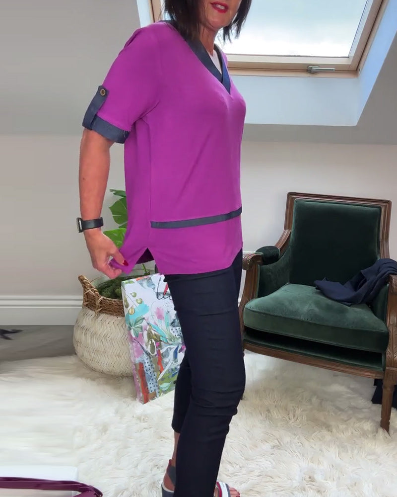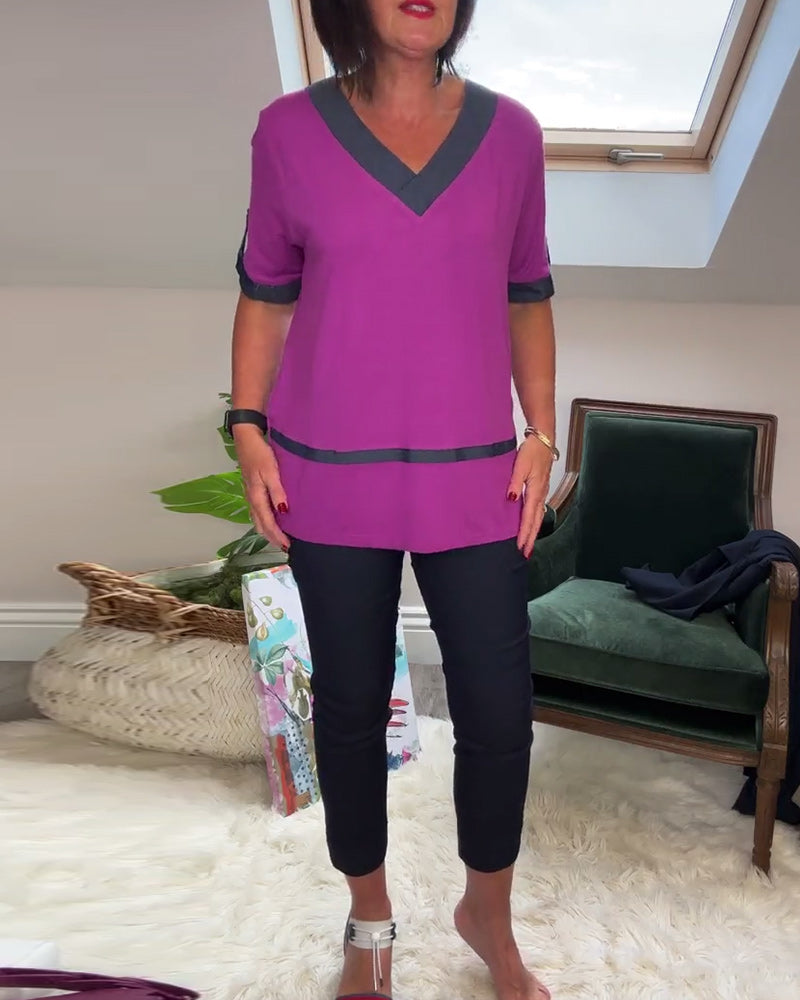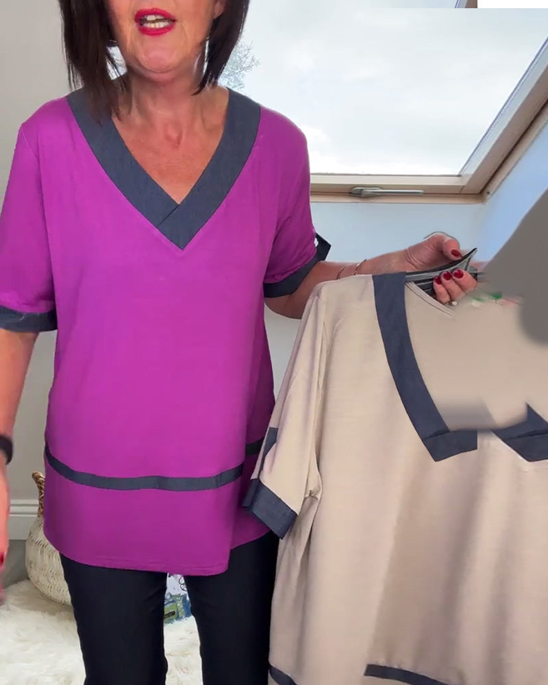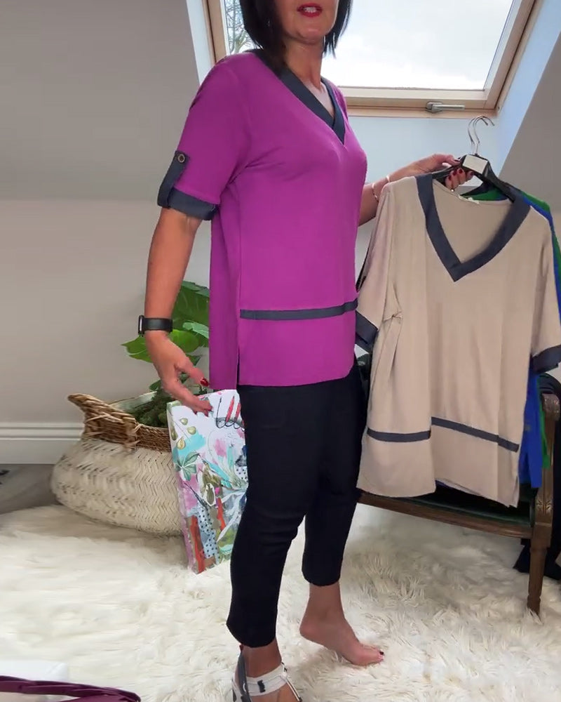 Lässiges Oberteil mit V-Ausschnitt und Farbblock-Print