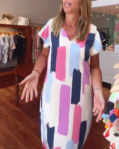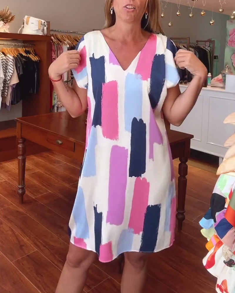 Lässiges rückenfreies Kleid mit buntem Druck und V-Ausschnitt