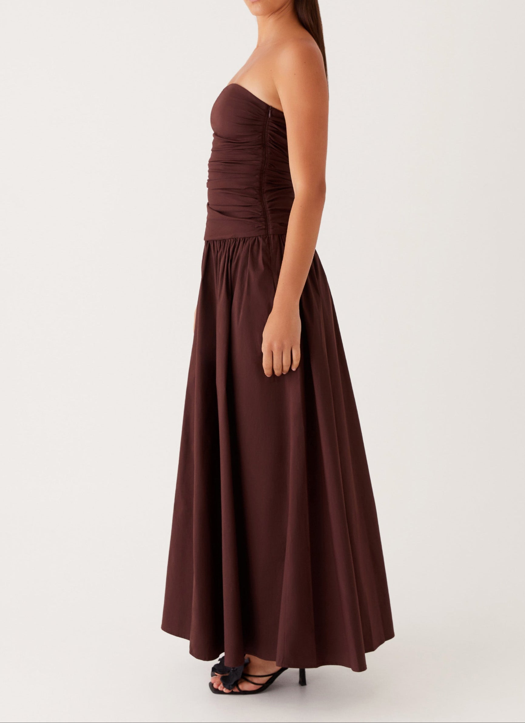 Mühelos elegant und auf zeitlose Raffinesse ausgelegt – dieses trägerlose Maxikleid überzeugt mit einem wunderschön gerafften Oberteil und einer fließenden A-Linien-Silhouette. Der klassische Elfenbeinton und der volle Rock schaffen einen traumhaften, femininen Look – perfekt für Hochzeiten, Gartenpartys oder andere besondere Anlässe.