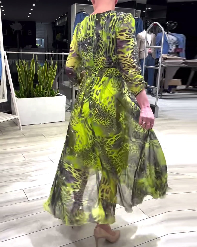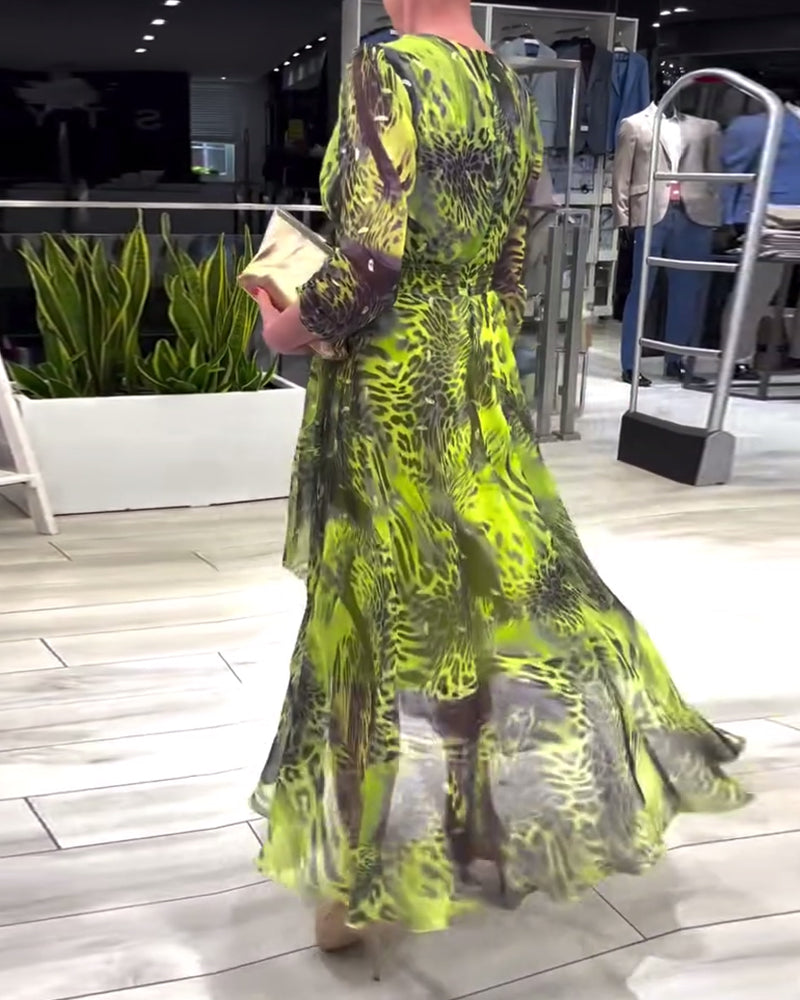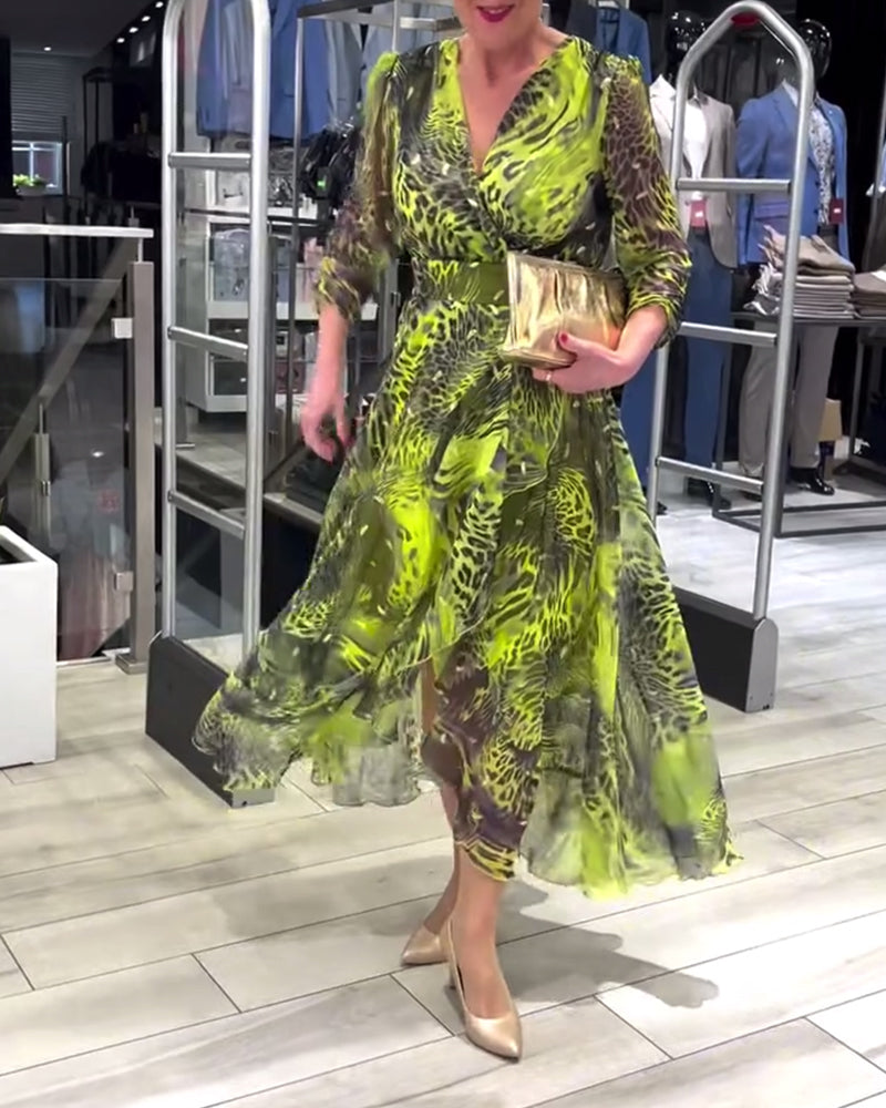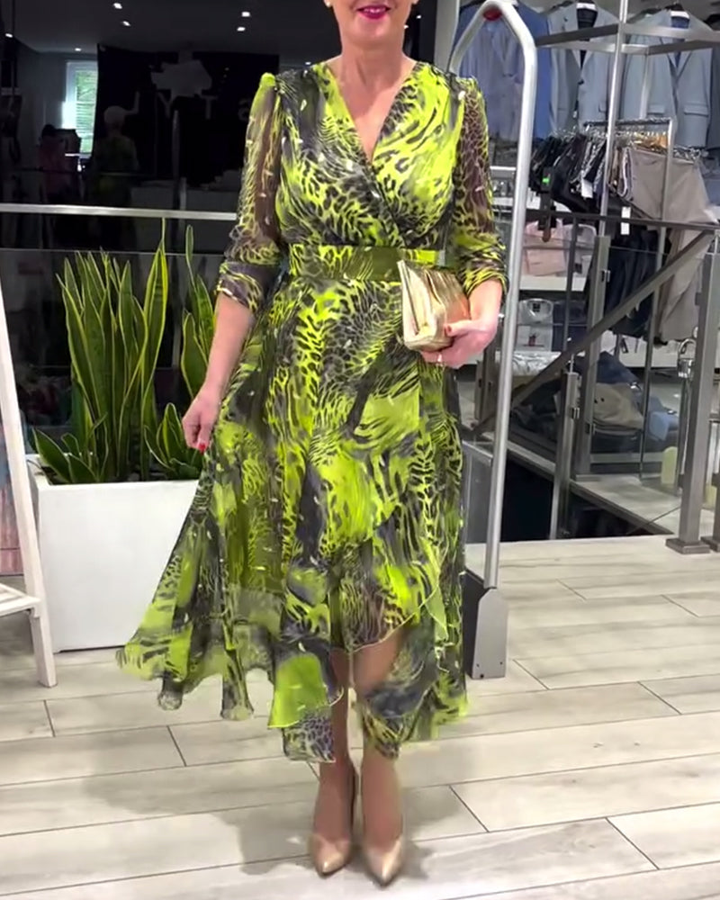 Modisches, bedrucktes kleid mit unregelmäßiger passform, v-ausschnitt und dreiviertelärmeln